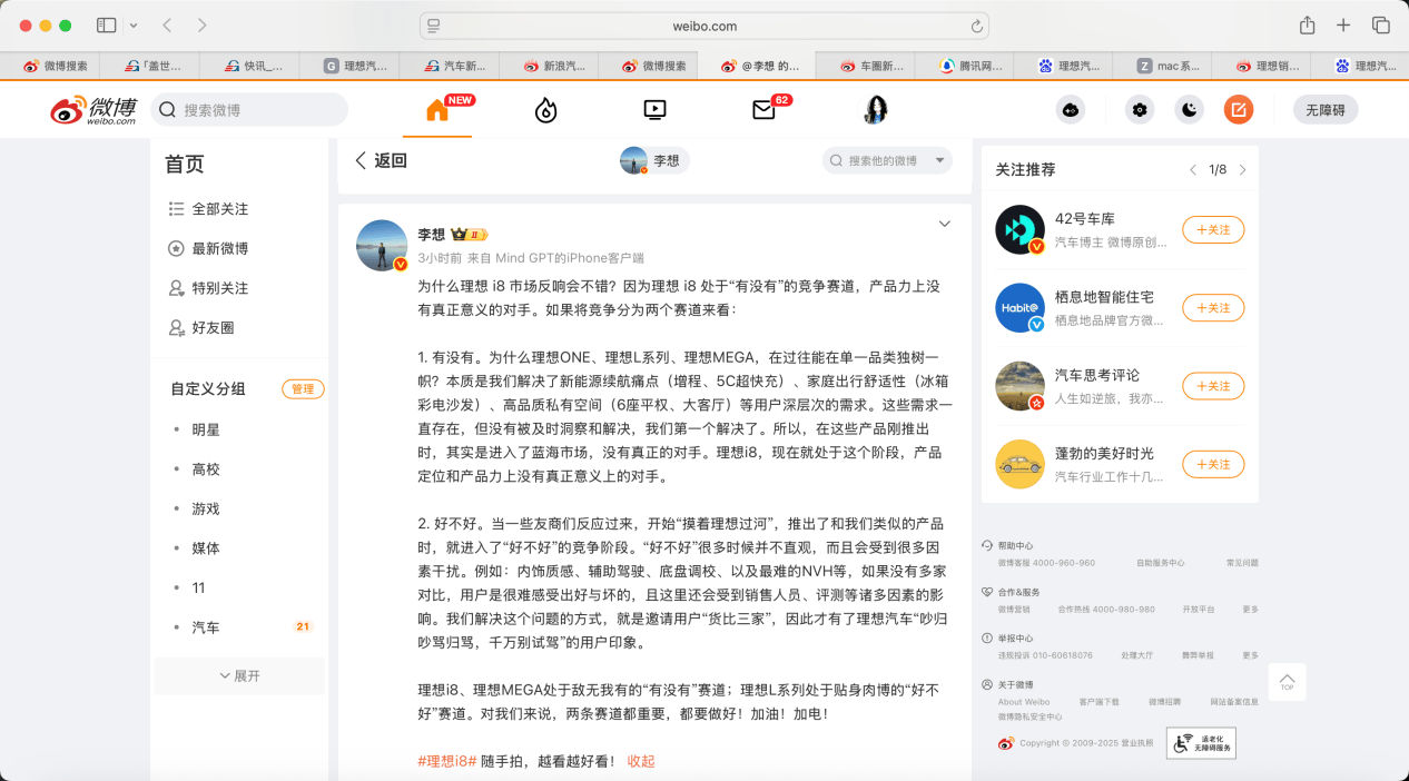 8月14日,李想在其微博拋出一套"競爭雙賽道"理論,他表示,"為什么理想i8市場反響不錯?因為它在'有沒有'的賽道里,產品力上沒有真正的對手。”