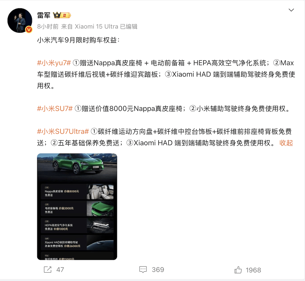 為了進一步促銷,雷軍在今日宣布,小米汽車推出9月限時購車優惠權益,涵蓋小米SU7、小米SU7 Ultra及小米YU7等車型,其中小米YU7優惠最高可達4.8萬元。